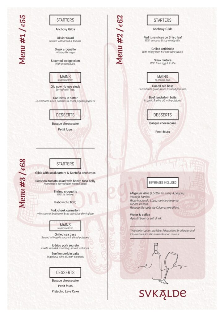 Each menu can be adapted for guests with allergies or intolerances, and we also offer vegetarian options upon request. At Sukalde, we want your group to enjoy an unforgettable gastronomic experience, with all the Basque essence and the charm of Palma.